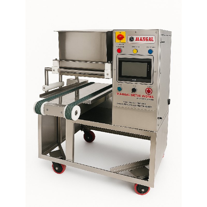 The Mangal Wirecut Machine is a fully computerized wirecut-only solution designed for high-speed and efficient production. It is suitable for variable tray widths, with tray length adjustable according to production needs. The machine is constructed with a complete stainless-steel outlet body and food-contact parts to ensure hygiene and durability. It is fitted with Rotomotive lifelong oil-filled gearboxes, AC motors, and a servo motor for consistent and reliable operation. A 7-inch Delta touch-screen HMI paired with a Mitsubishi PLC (Japan) provides precise control, while operation is supported by a 3-phase 415V AC power supply. This machine offers high-speed wire-cut functionality and is supplied with two wirecut dies, with designs selected as per the manufacturer’s choice.